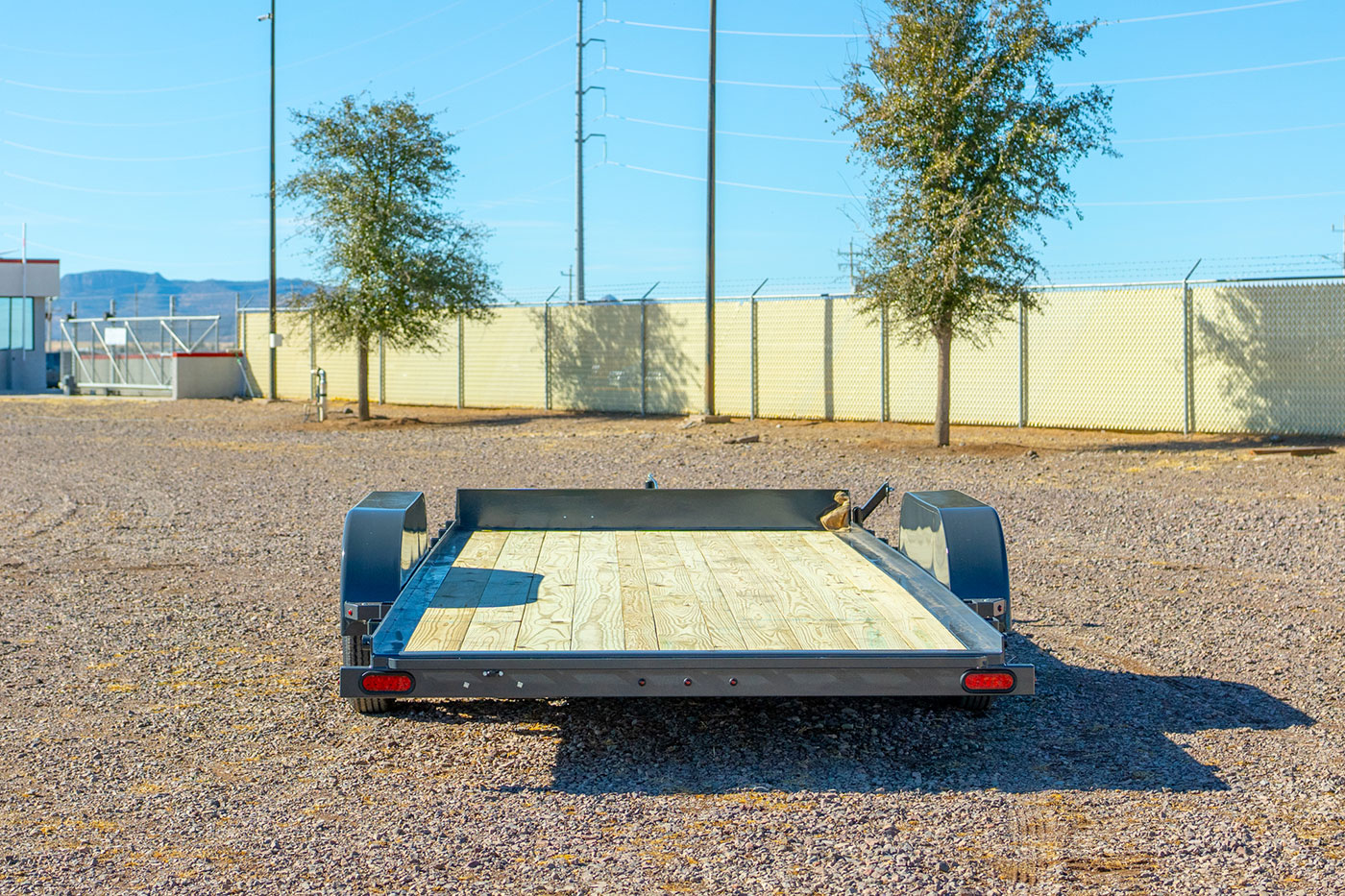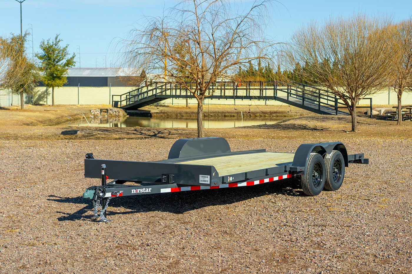 The Norstar ECB car hauler is a rugged, professional-grade trailer built on a heavy-duty 4" angle frame with dual 3,500 lb axles. Designed for easy loading, it features a treated wood straight deck and high-traction slide-in punch plate ramps. Finished in a sleek gray powder coat, this trailer is equipped with removable smooth fenders, an adjustable 10k coupler, and 8-ply radial tires, providing a versatile and durable solution for all your hauling needs.